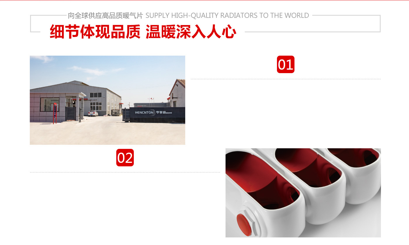 我公司高度重视产品质量,建立了以总经理为首的质管体质,层层把关,实行全面质量管理,产品行销全国各地,深受广大客户信赖,本厂将以完善的管理,专业的设备,优质的产品,获得更大的发展,亨享通散热器愿与您携手共赴锦绣前程。